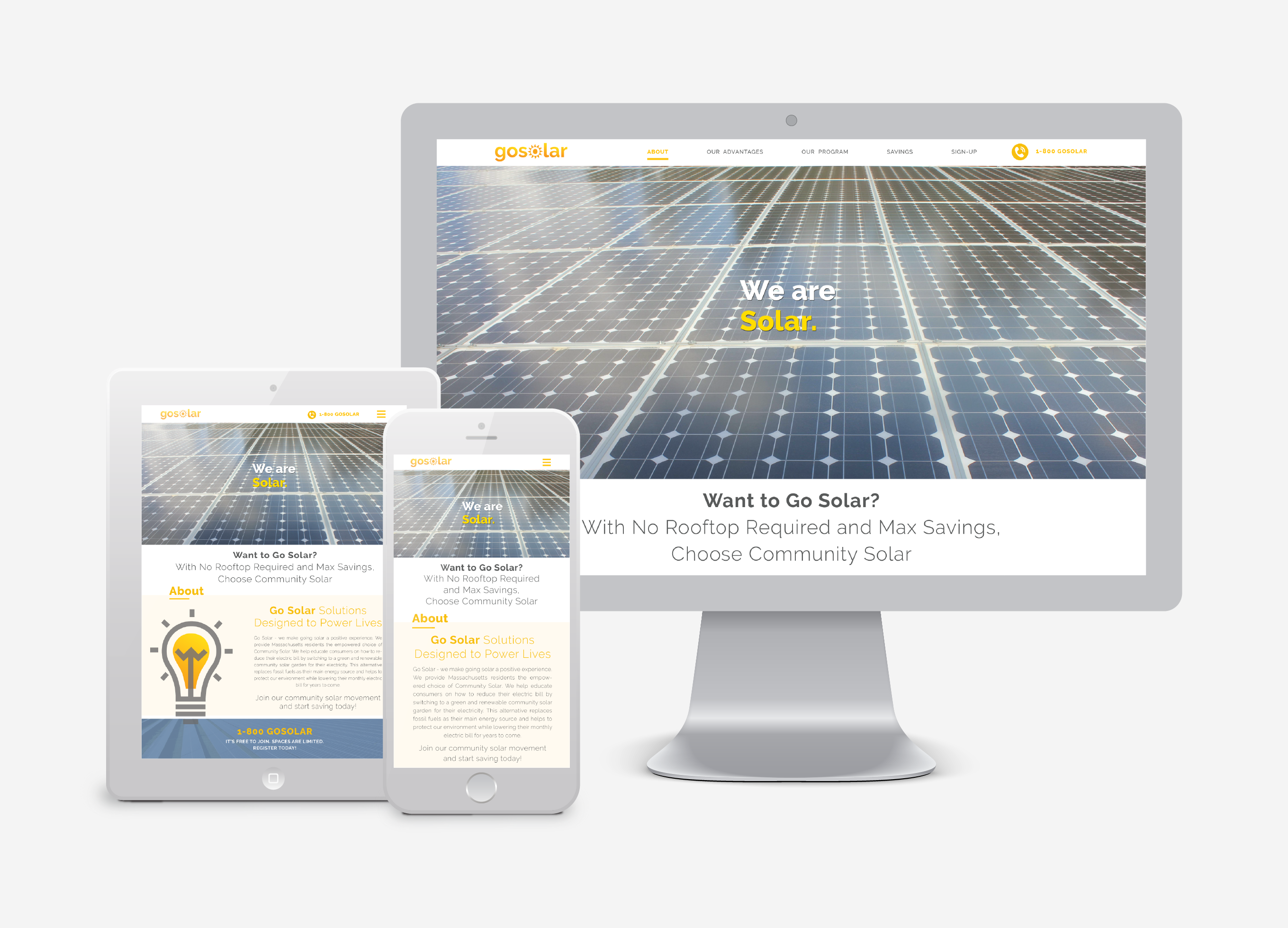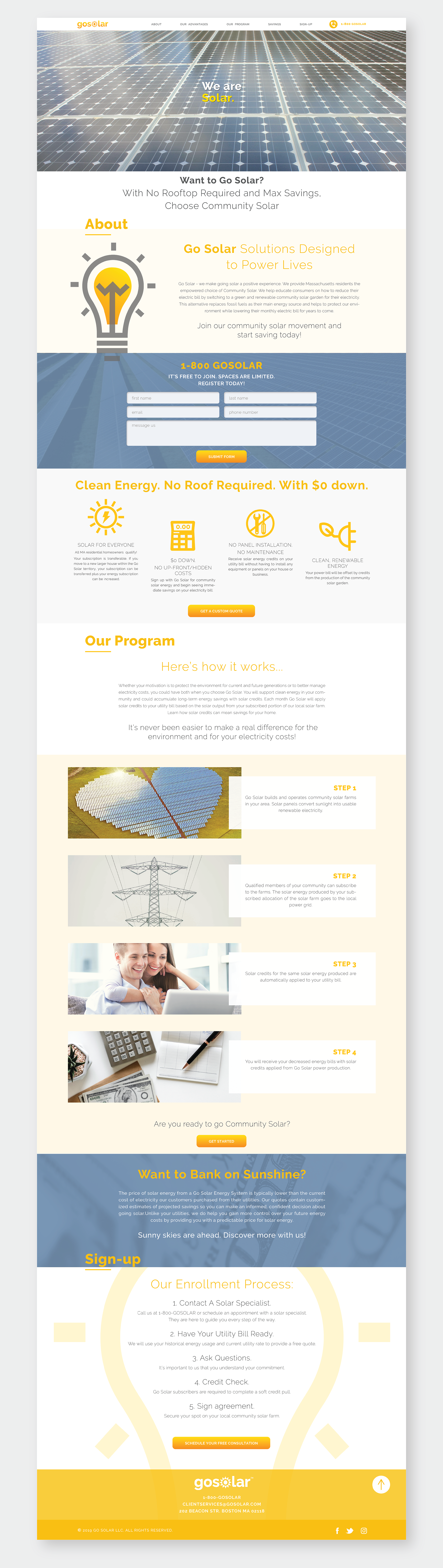 This is a website concept for Community Solar project. Go Solar helps educate consumers on how to reduce their electric bill by switching to a green and renewable community solar garden for their electricity. This alternative replaces fossil fuels as their main energy source and helps to protect our environment while lowering their monthly electric bill for years to come.
